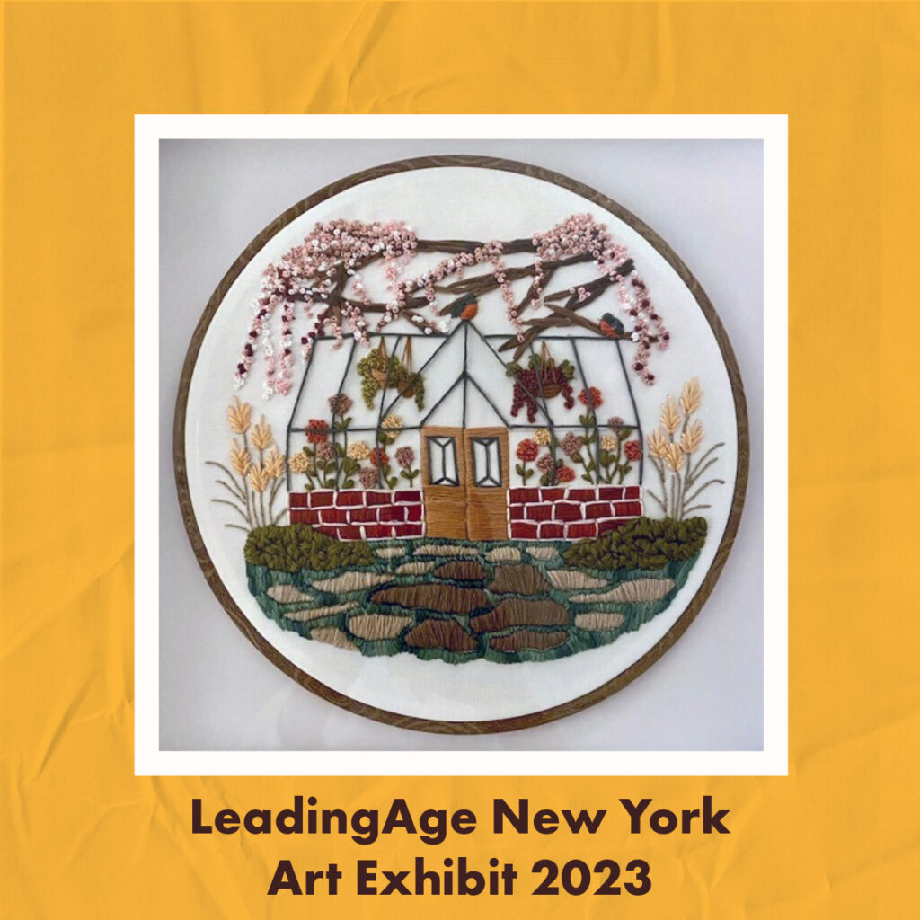 This year’s exhibition is composed of 70 pieces of work from 60 individuals living in organizations that are members of LeadingAge New York. The remaining 10 pieces are created by staff and volunteers in these organizations. Cara Granger, Speech Therapist at Jewish Home, will receive a Merit Award for her embroidered piece, “Spring Time at Highland Park.” Honorable Mention will be given to a photograph by Rabbi Steven Rubenstein, Jewish Home’s Director of Chaplaincy Services, and an oil painting by Stacey Rowe, Communications Manager. Three judges from member facilities served as jurists, including Jewish Home’s retired Creative Arts Therapist, Robert Whiteside. Art not featured in the traveling exhibit is displayed in the gallery and offices at LeadingAge New York’s headquarters in Latham, New York.